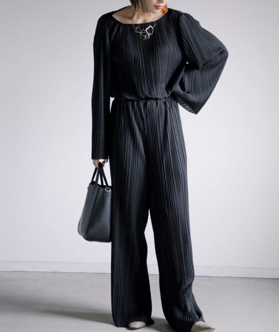 今シーズンは同素材の細プリーツワイドパンツとセットアップで着用がおすすめ