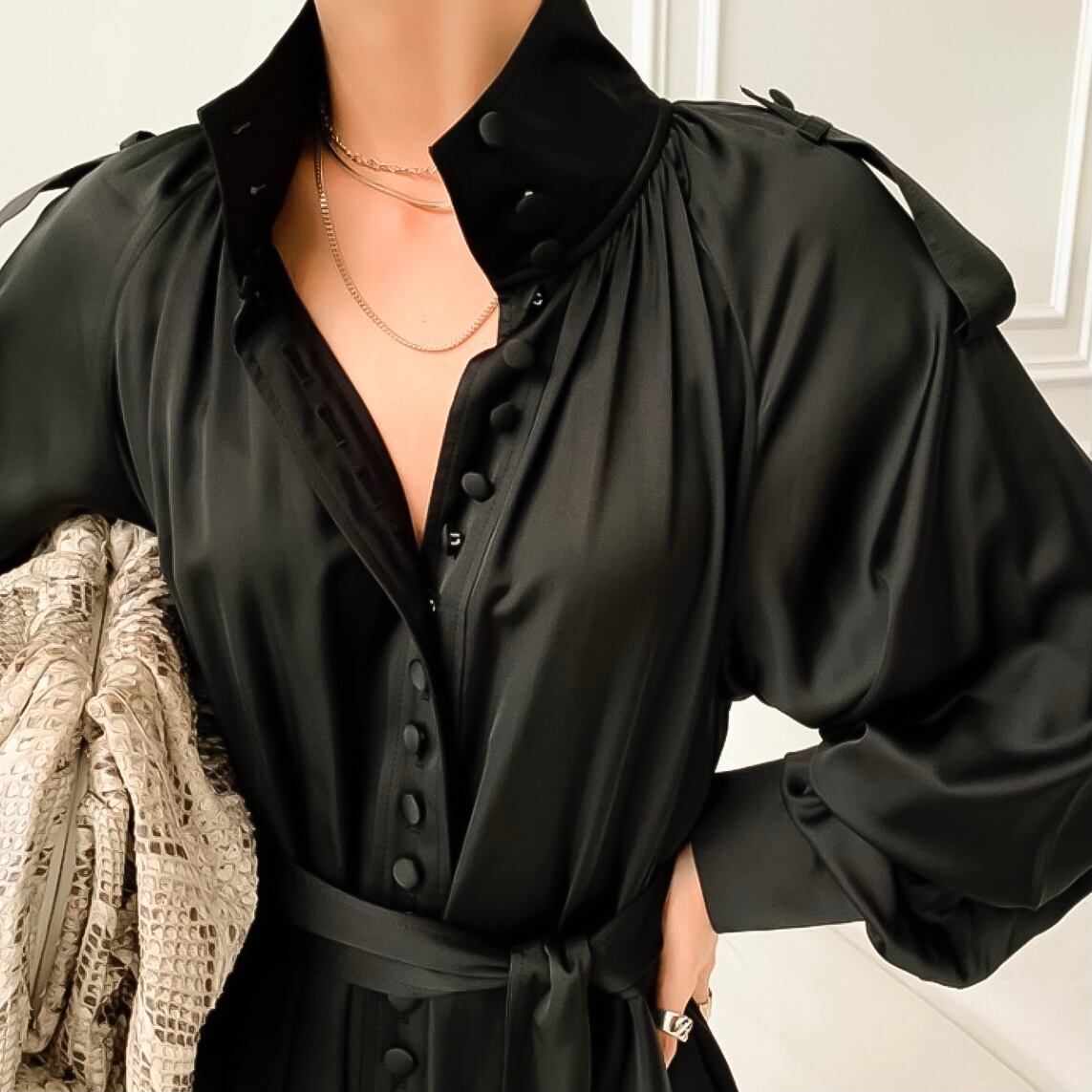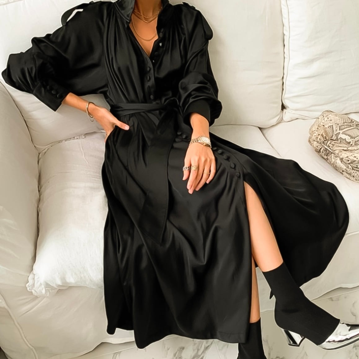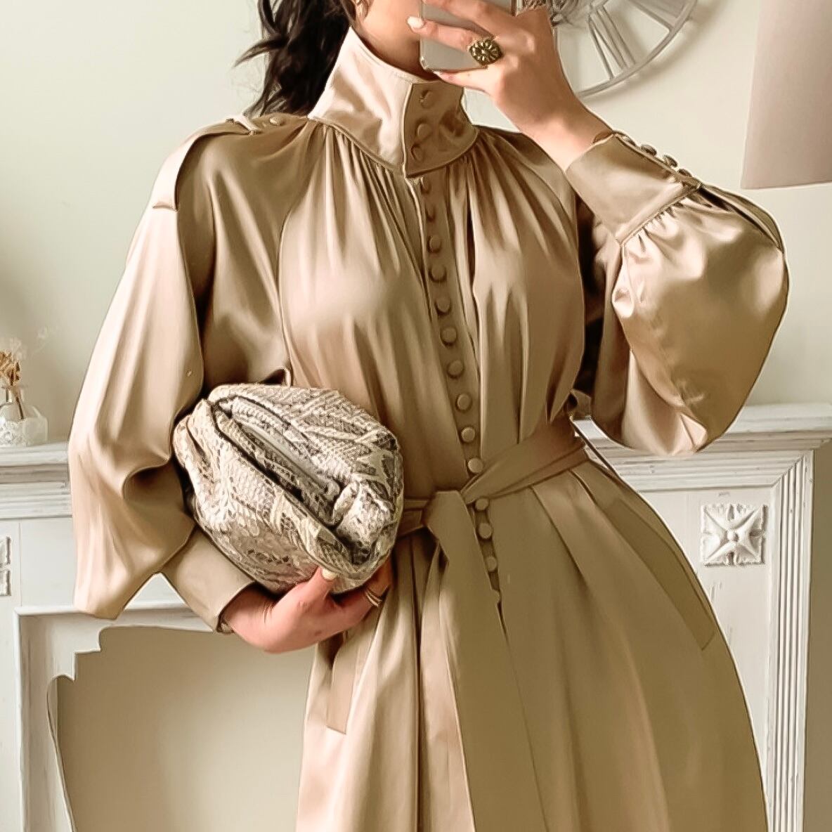 ボタン付きハイネックのユニークなデザインがストイックな神秘感を見せる大人のワンピースコート。