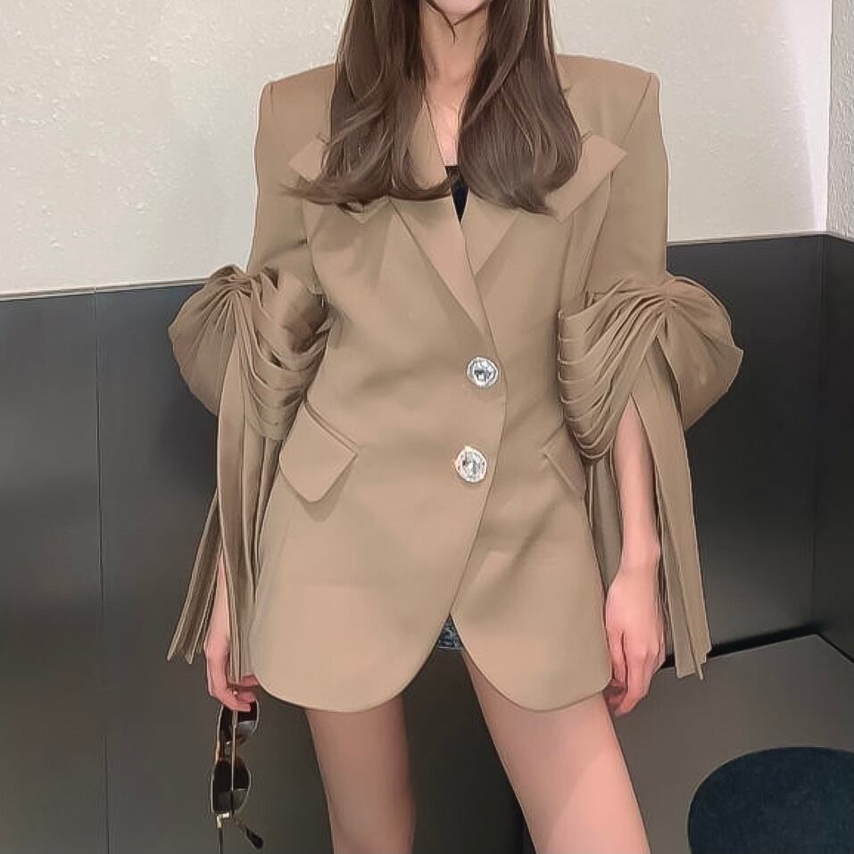 メンズライクな少しオーバーサイズなジャケットのお袖に存在感のあるデザインを。
