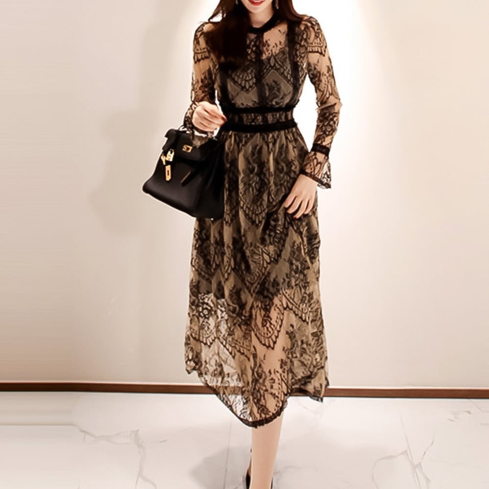 パーティーに最適なシースルーエレガントレースワンピース。露出は少なく膝下丈なのでシーンを選ばずにご着用頂けます。