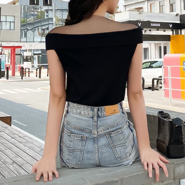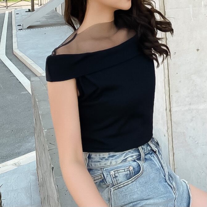 シンプルなブラックトップスのネック部分にシースルーをプラス。