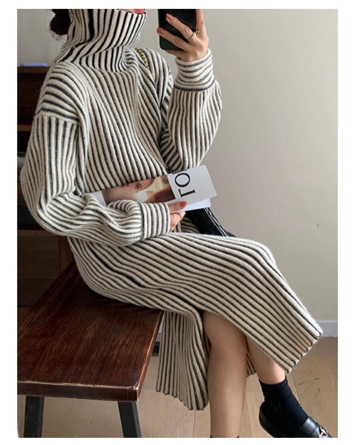 1着でスタイリングが完成するタートルデザインのニットワンピースです。飽きのこないストライプ柄と体のラインを拾いすぎないざっくりとしたシルエット。ブーツと合わせれば上品さも兼ね備えた大人カジュアルスタイルが完成します。