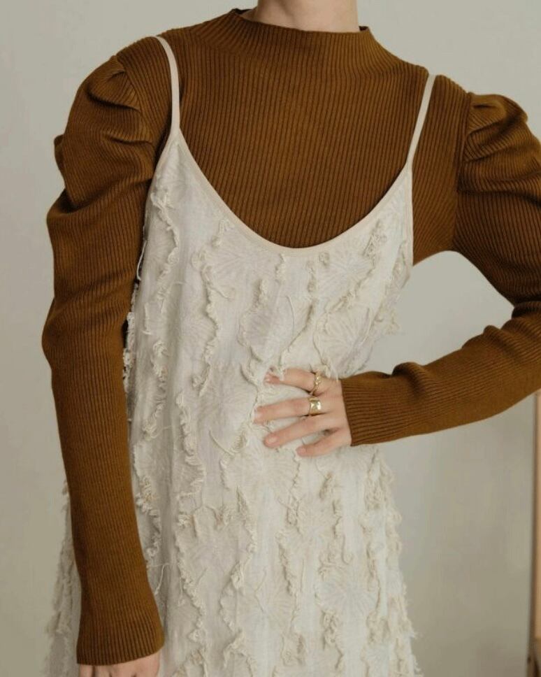 レーヨンが入ったなめらかな糸を使用しているので肌触り◎でストレスフリーにご着用頂けます。細番手の糸で編まれたニットは重ね着してもゴワつくことがないので1枚持っているとスタイリングに重宝するアイテムです。