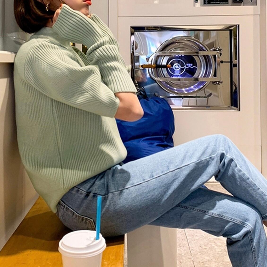 プチハイネックがさりげなく顔まわりにキュートなアクセントをメイク、スマートなルックスに導く、すっきりとした印象のニットトップスです。