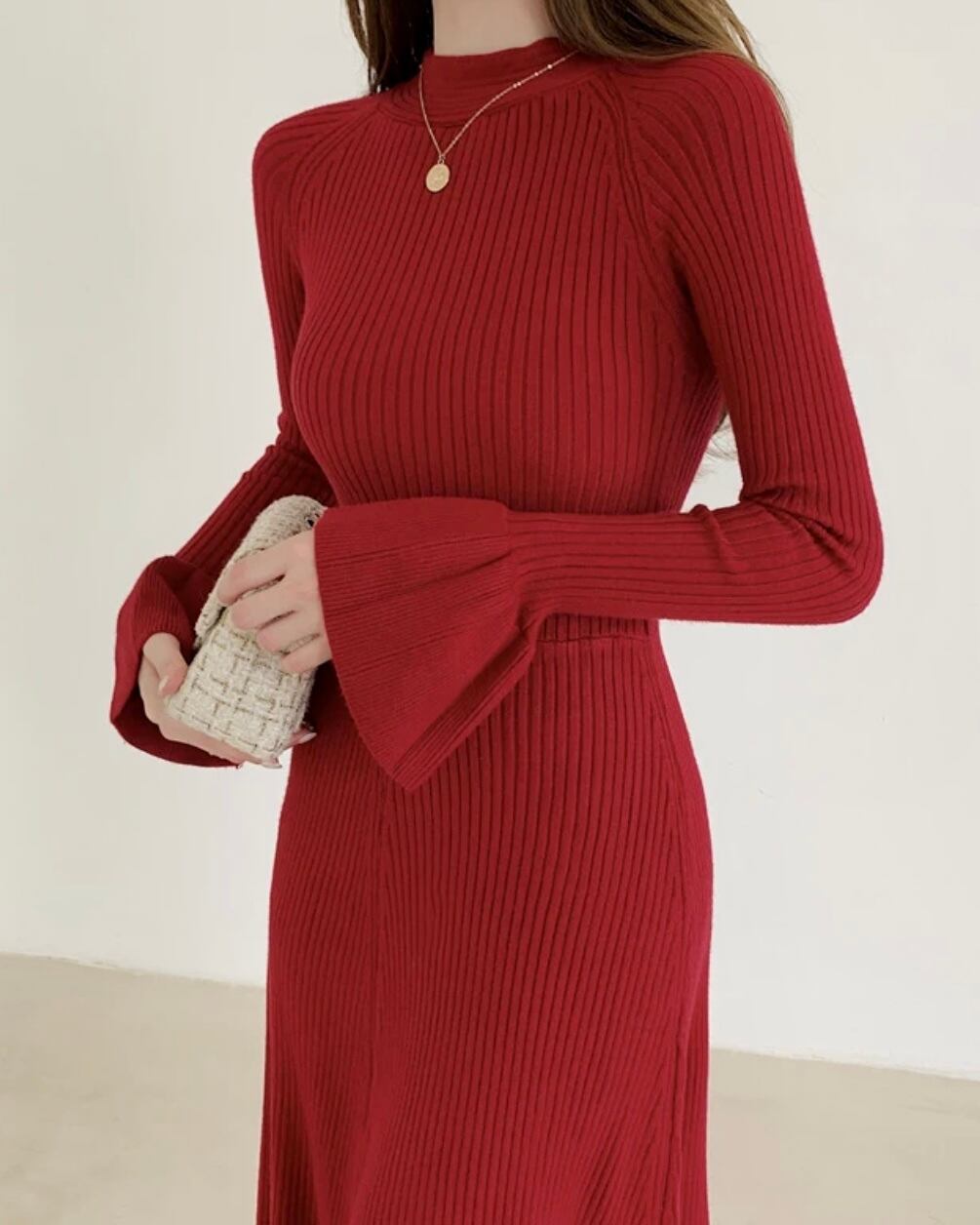 Vニットフレアワンピースドレス