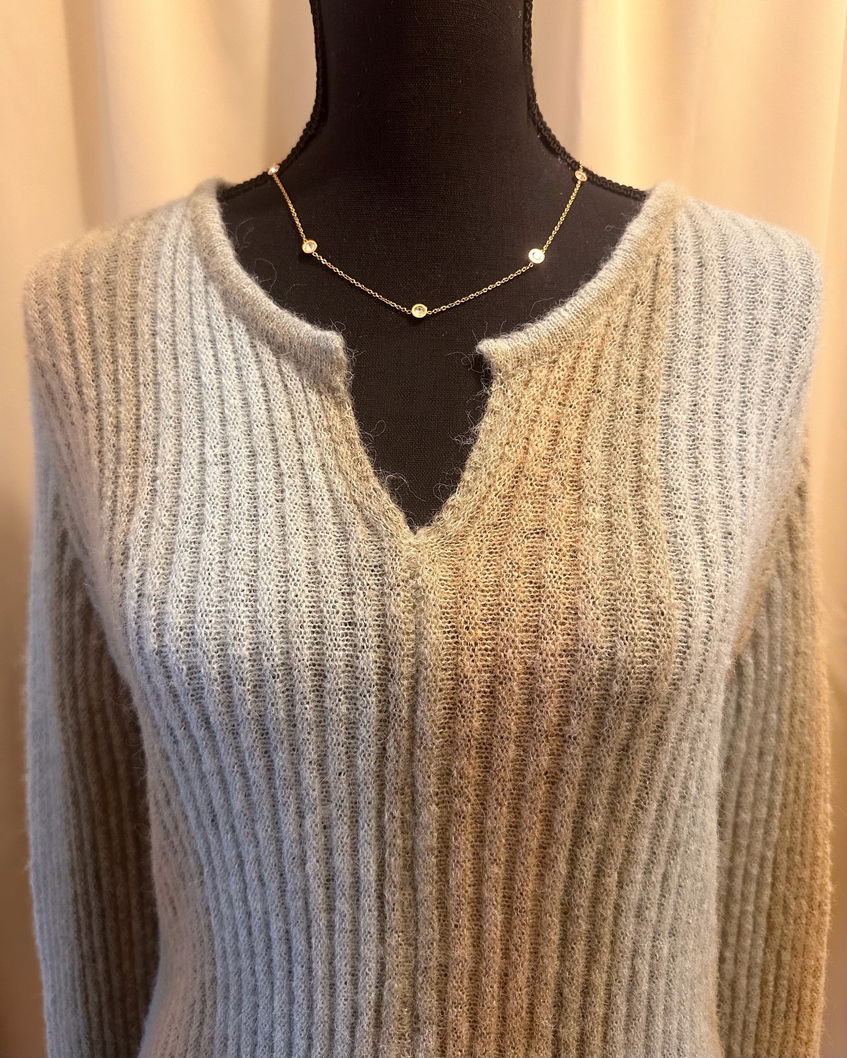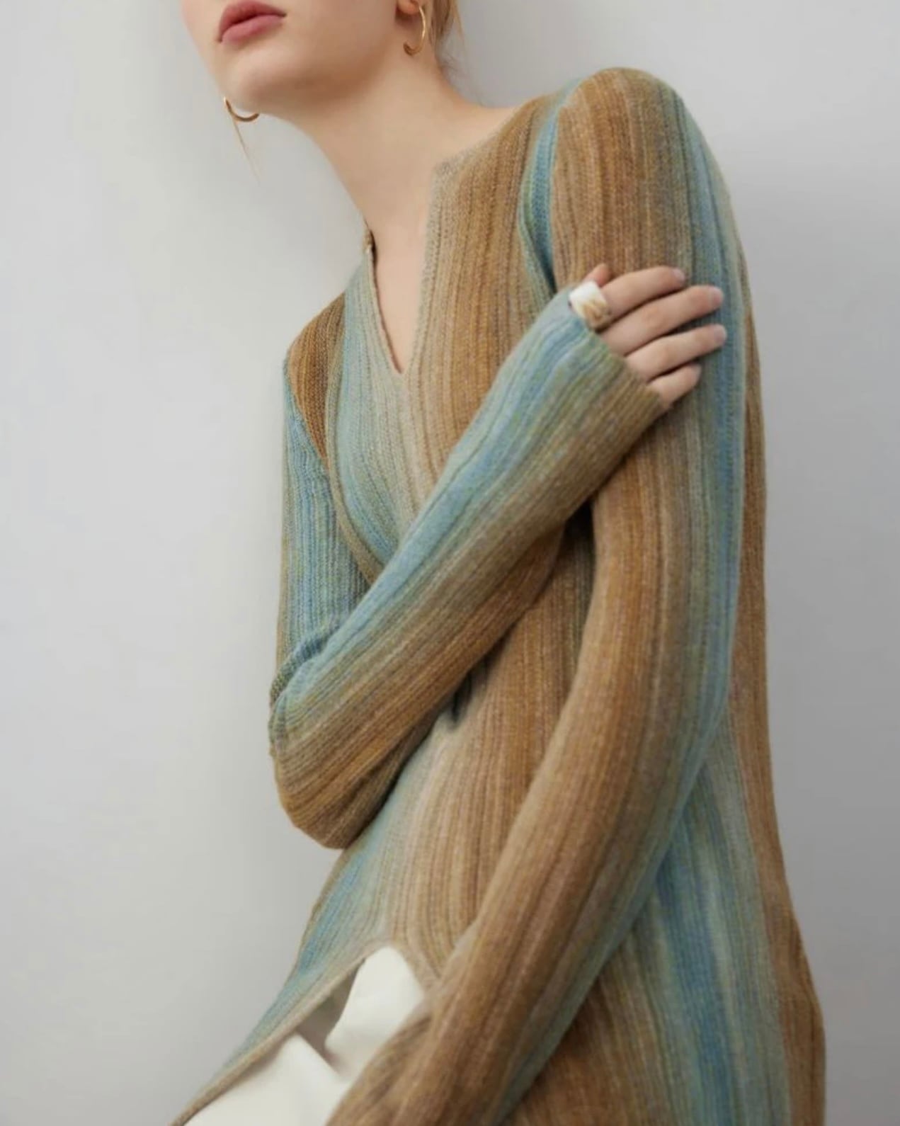 着痩せ効果抜群絞り染めが美しい、Vネックのスリムニット。