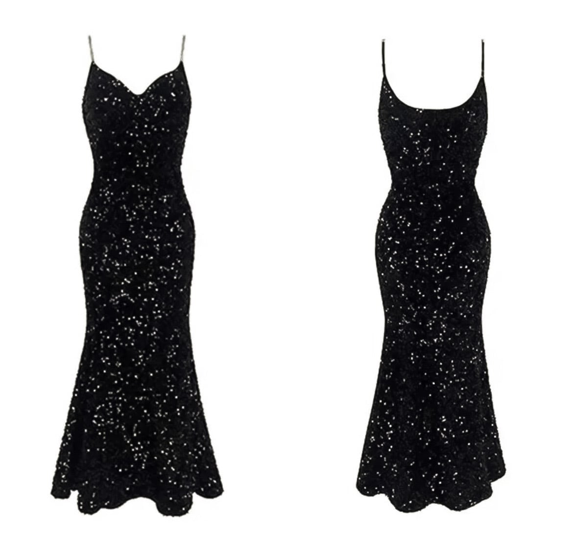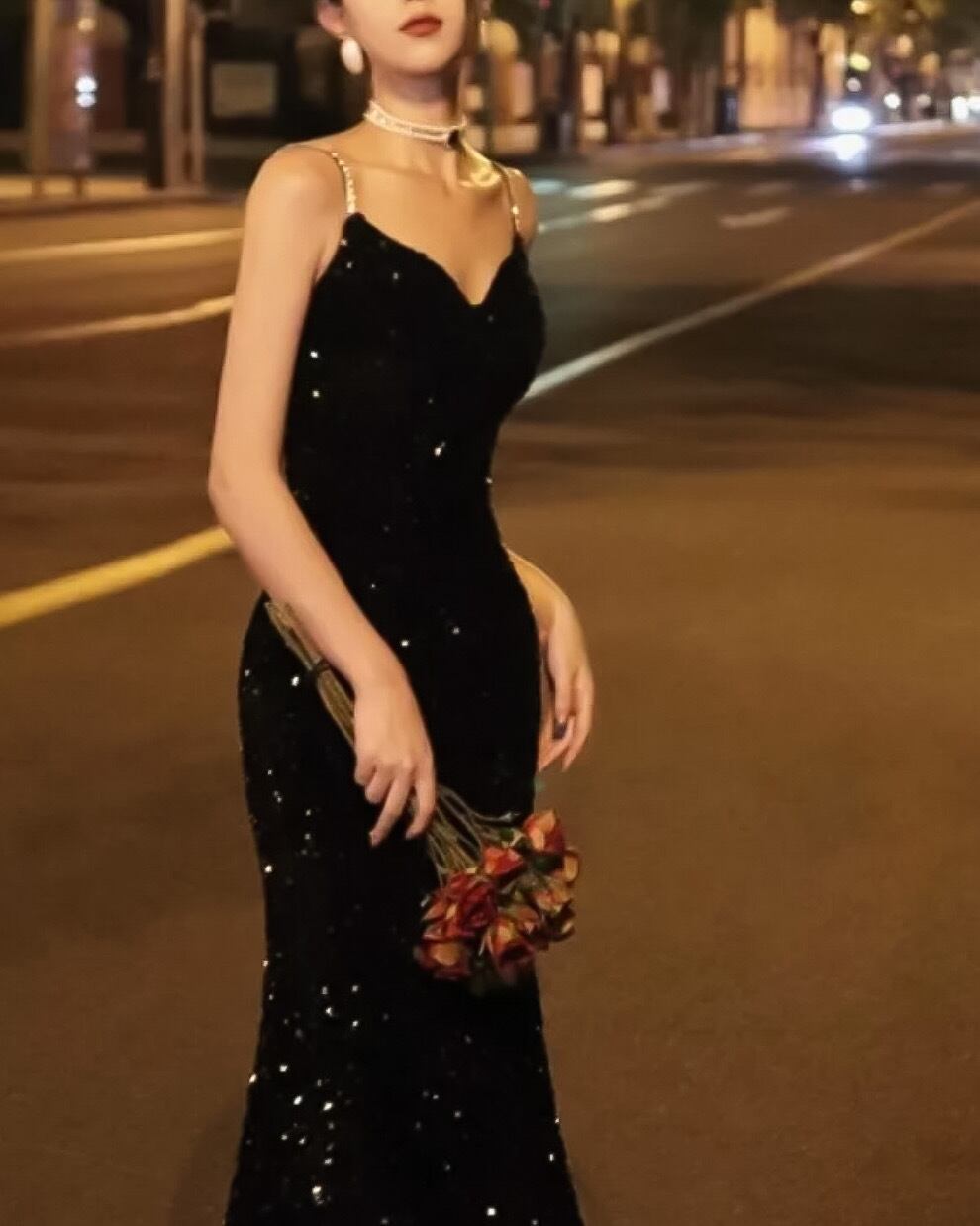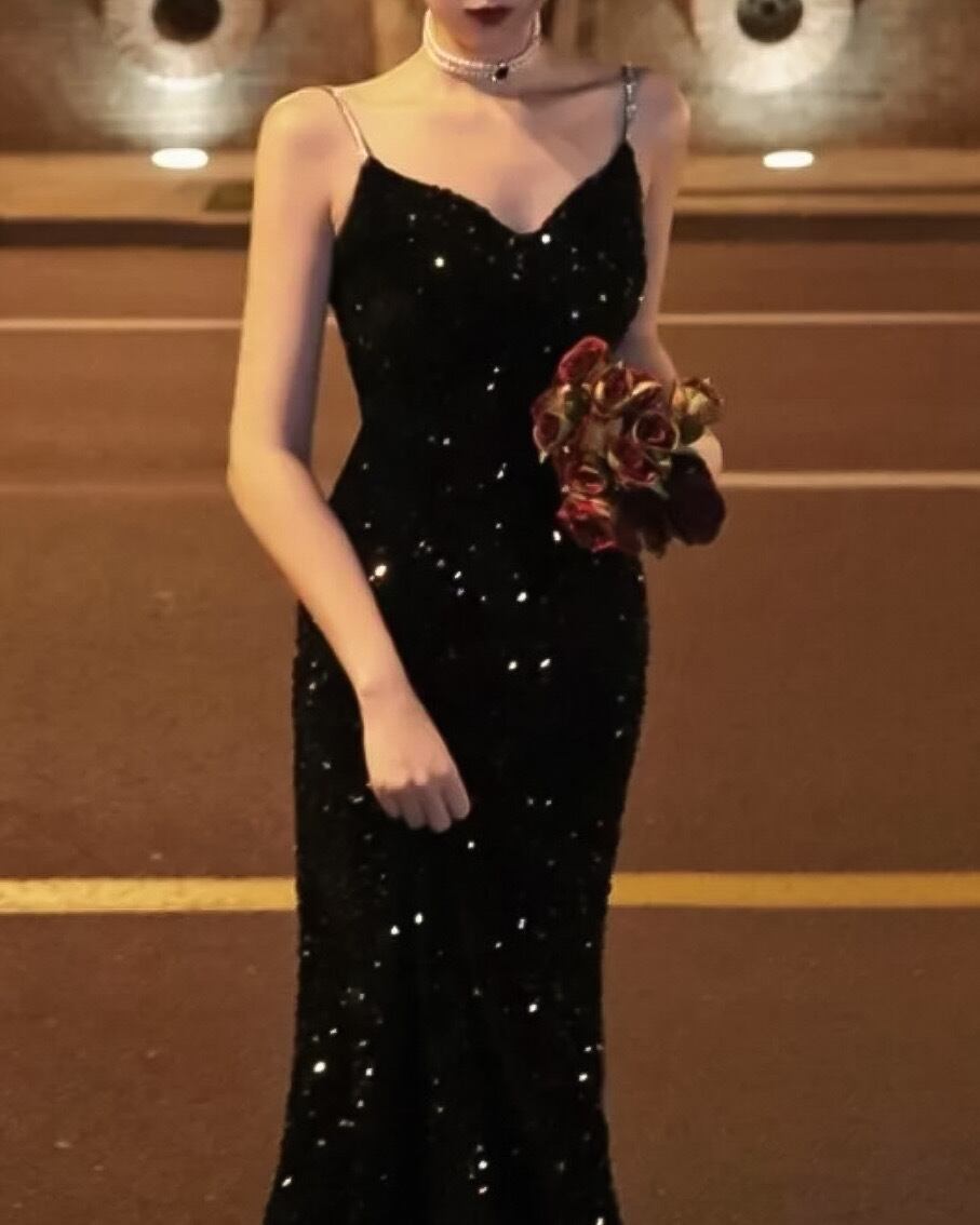 ブラックスパンコールキャミソールワンピースは、キラキラ輝くスパンコールが特徴の華やかなワンピース。
