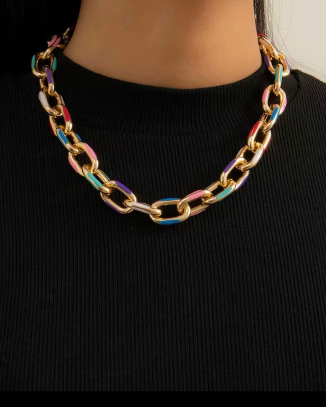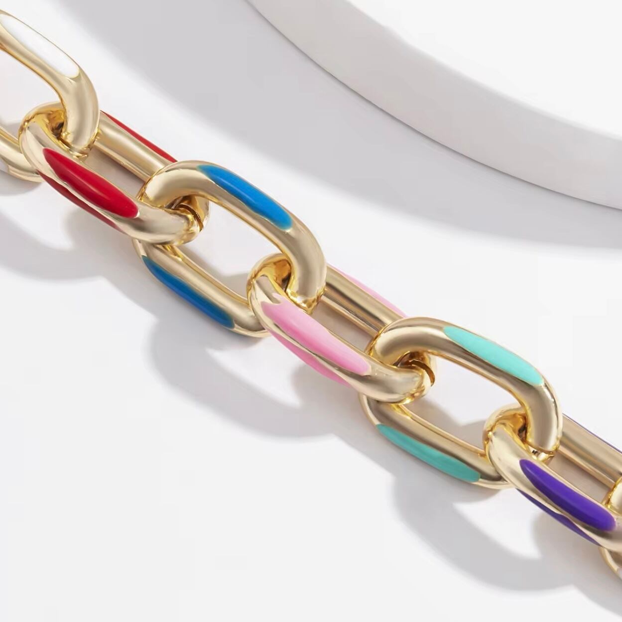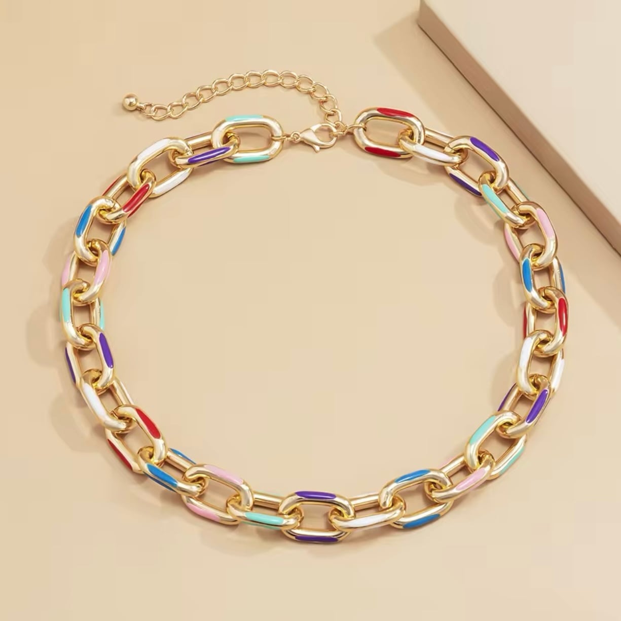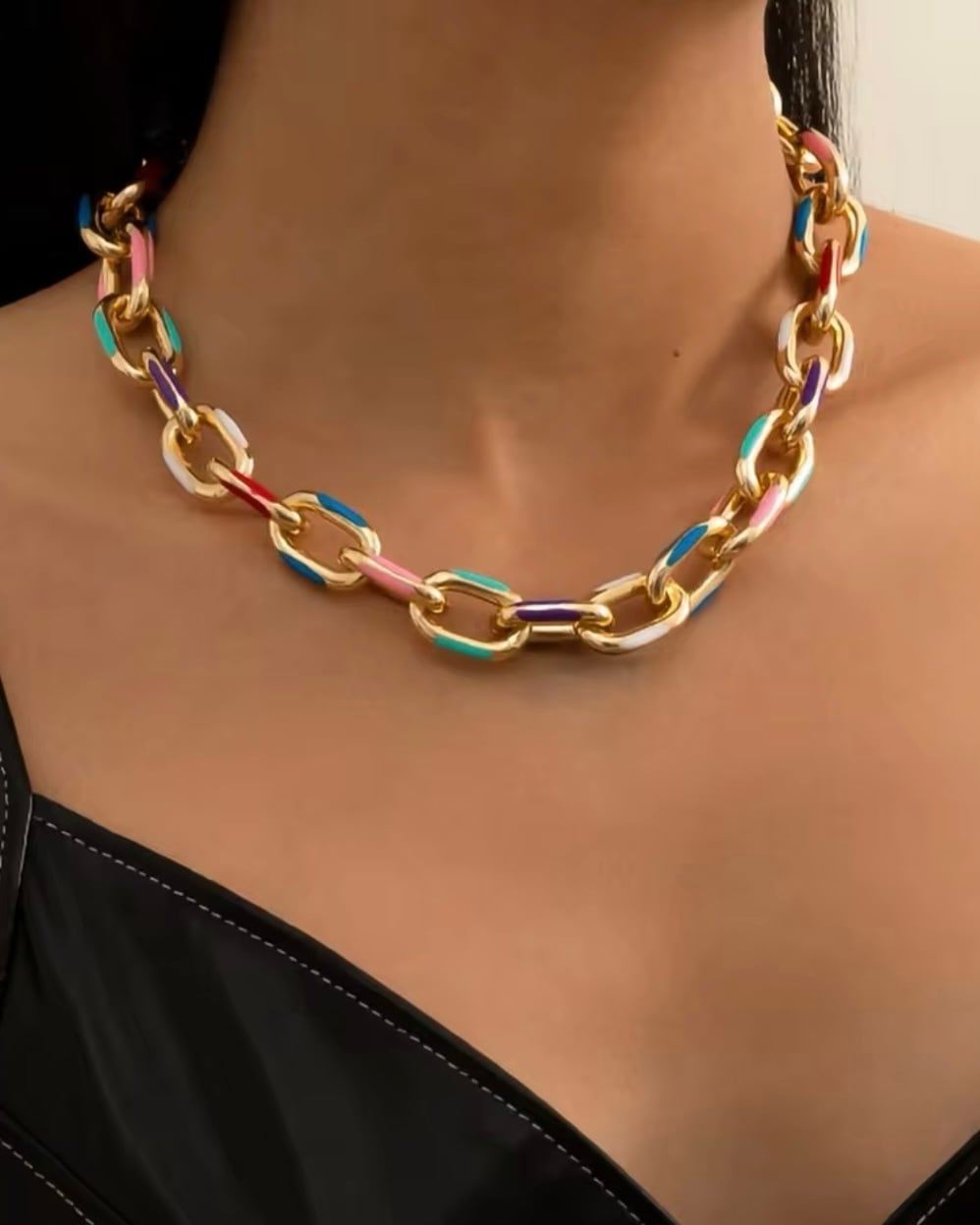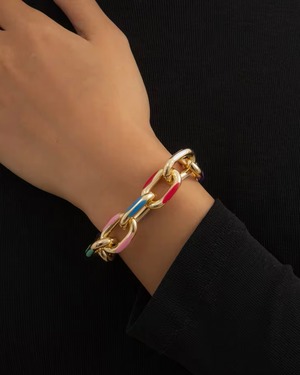 ゴールドチェーンとカラフルなアクセントが融合し、モードでクラシカルな雰囲気を演出します。これ一つでお洒落に決まる、かっこよさと可愛さを兼ね備えたアイテムです。