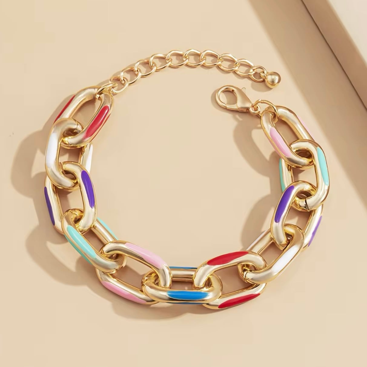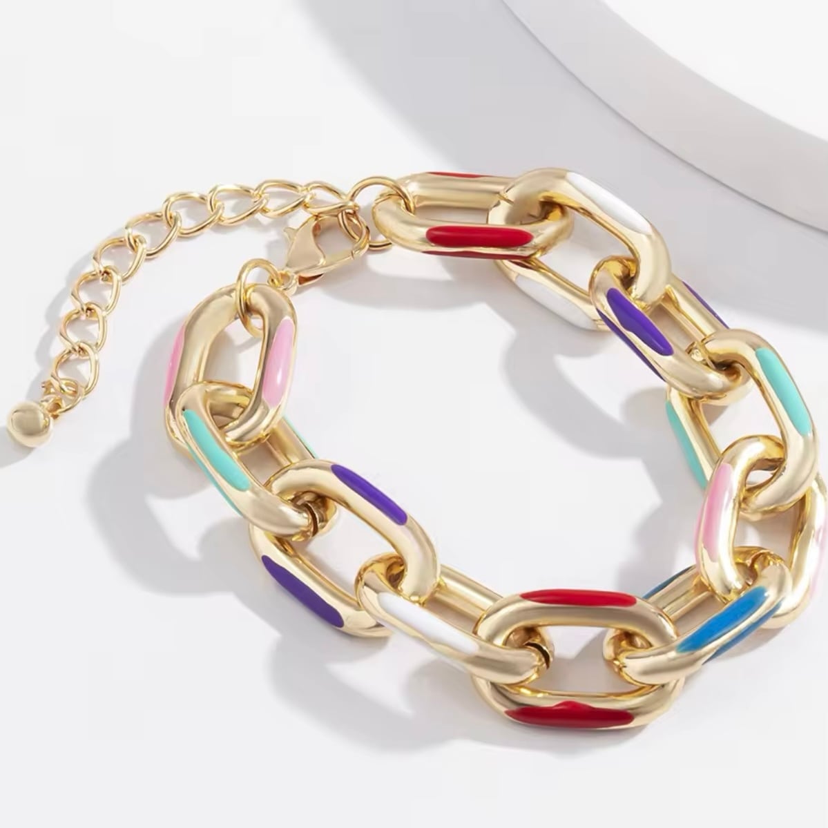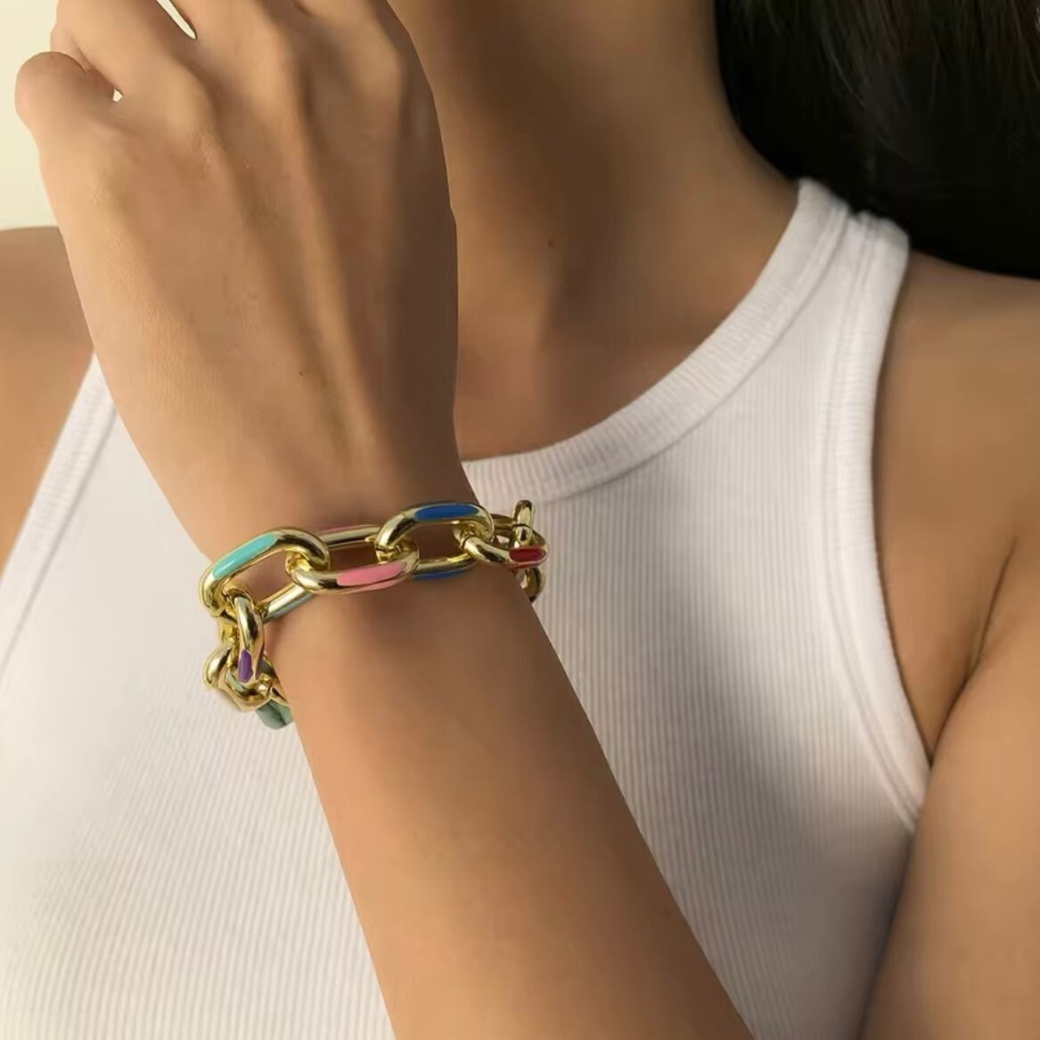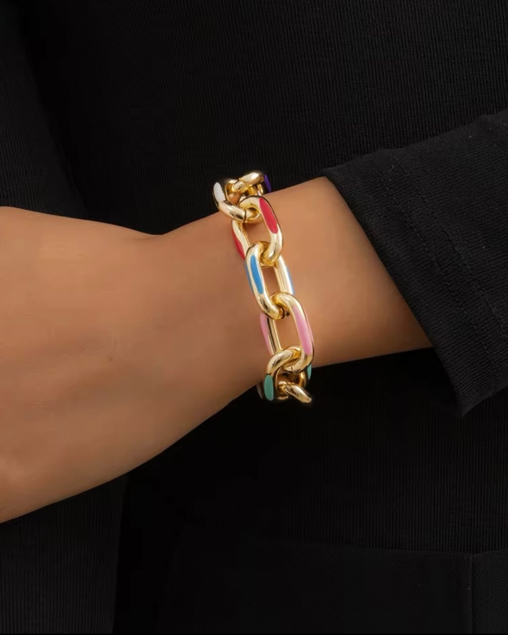 ゴールドチェーンとカラフルなアクセントが融合し、モードでクラシカルな雰囲気を演出します。これ一つでお洒落に決まる、かっこよさと可愛さを兼ね備えたアイテムです。